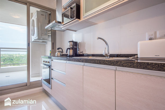 2 Dormitorios (principal en suite) más un baño completo, cocina definida con terraza lavadero y living comedor con terraza principal.