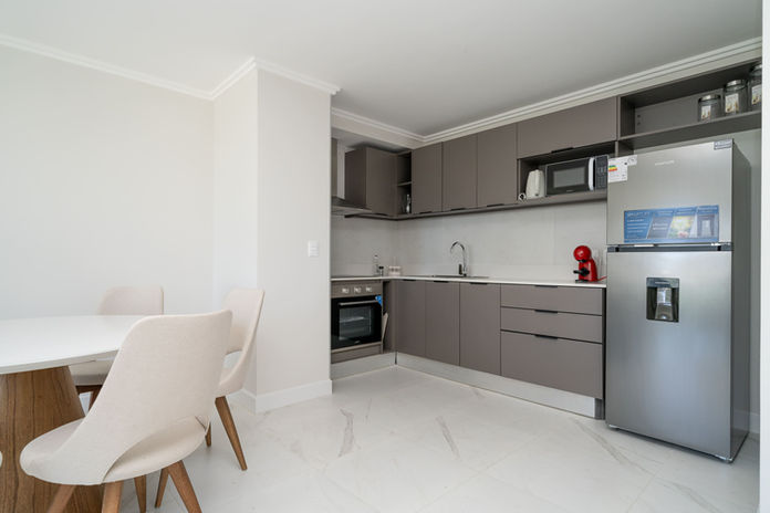 Amplio living comedor con salida a gran terraza frente al mar de la mansa con parrillero propio. Tipología con cocina integrada, equipada con muebles bajo y sobre mesada, horno, campana, anafe y calefones.